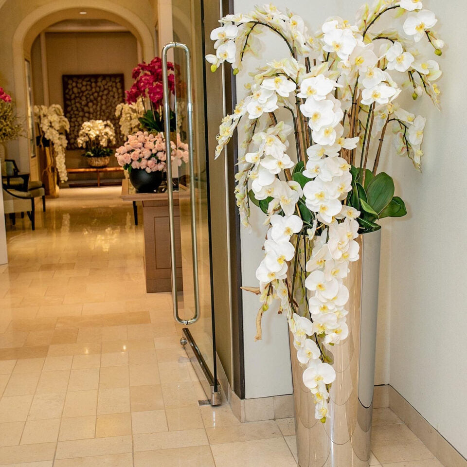 Faites une déclaration de luxe avec cet arrangement d’orchidées Phalaenopsis blanches en cascade, installé dans un cône évasé en acier inoxydable poli au fini miroir. Conçu dans les moindres détails avec des matériaux haut de gamme, ce pièce unique associe élégance contemporaine et réalisme saisissant, tout en restant entièrement sans entretien.